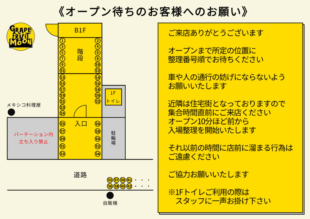 それ以前の時間に店前に溜まる行為はご遠慮願います。